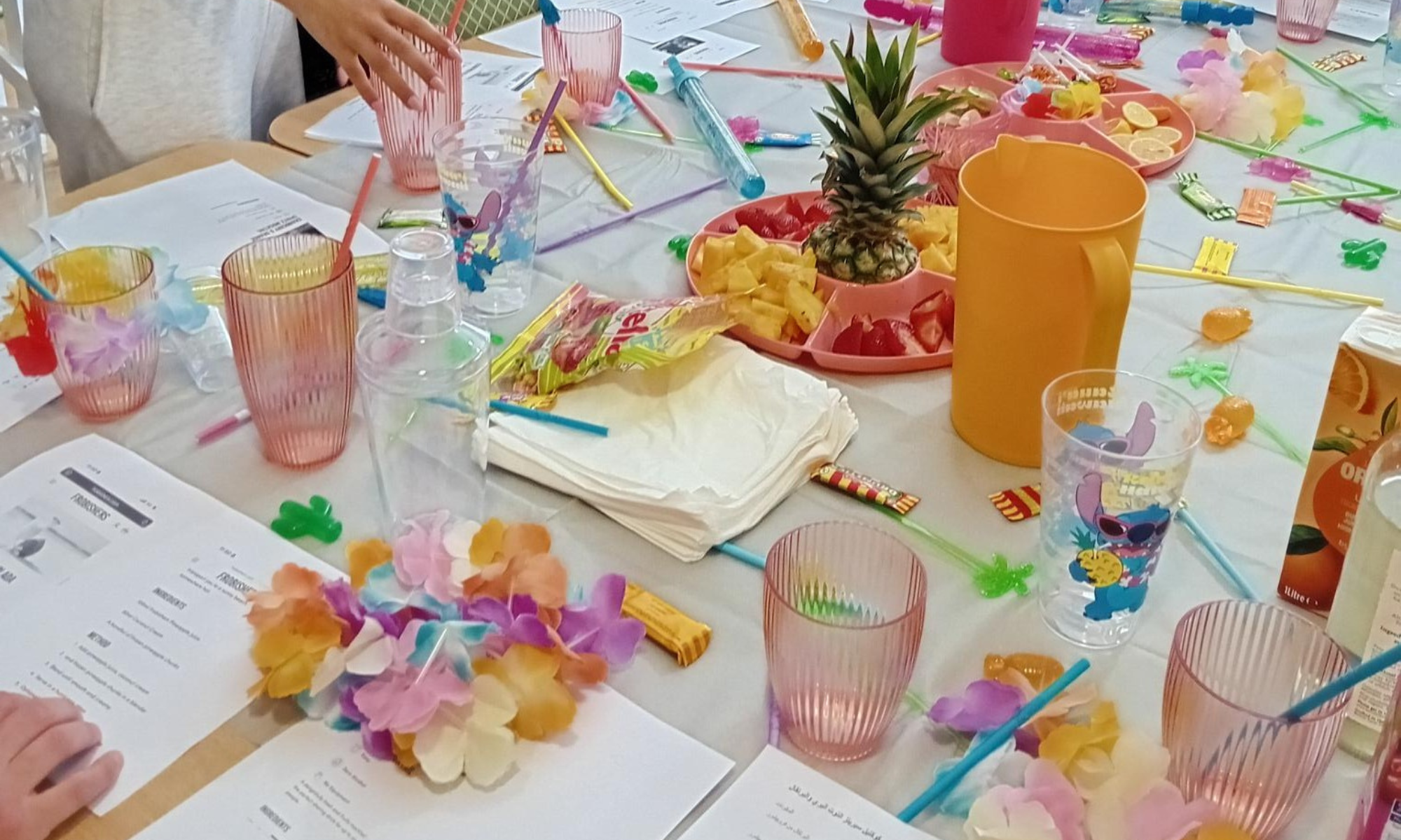 A burst of colour and creativity at one of our mocktail sessions. From fruity garnishes and tropical straws to recipe sheets and floral leis, every detail is designed to make sobriety feel celebratory. Victims and survivors gathered around the table to blend, shake, and share in a safe, alcohol-free space, proving joy doesn’t need gin.